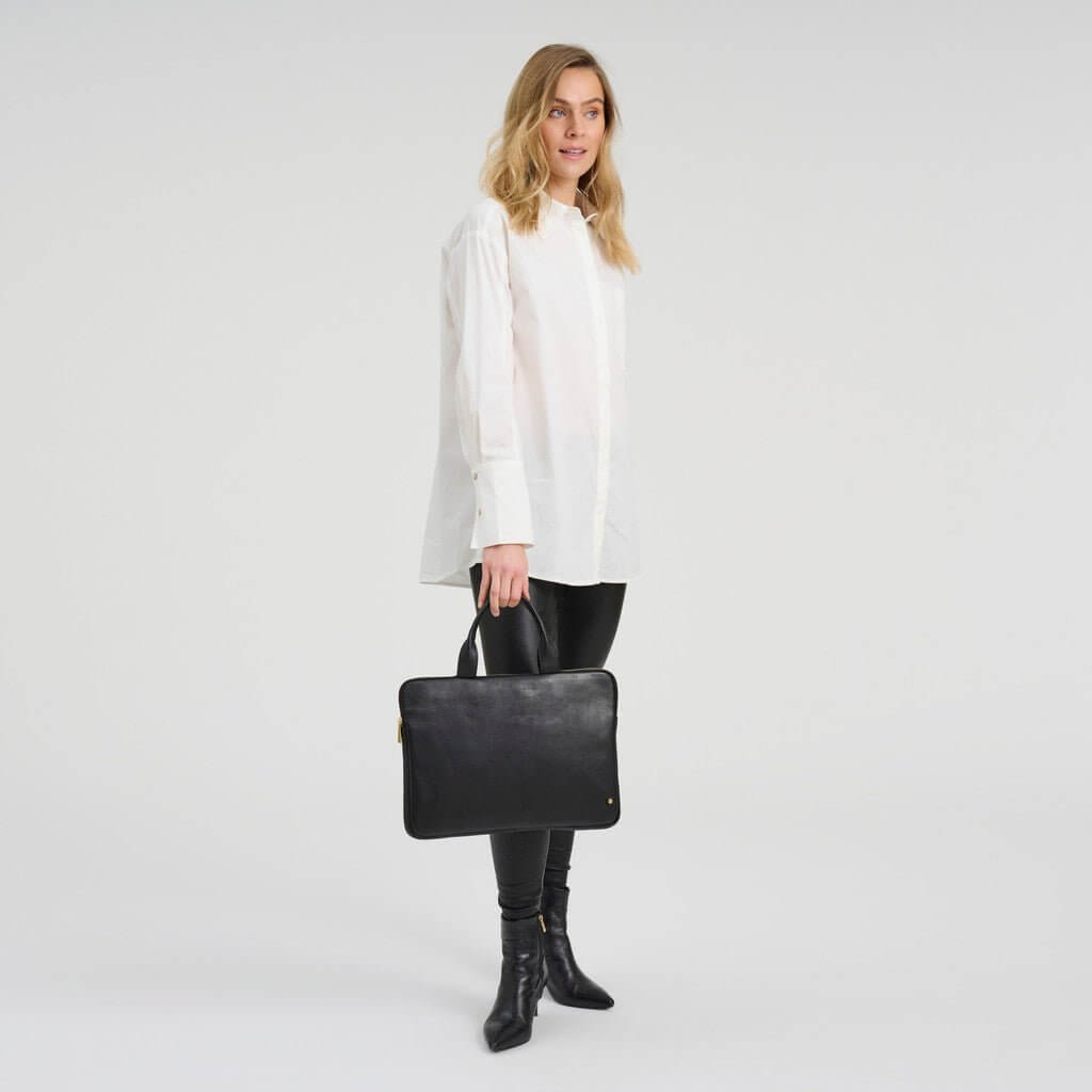 Sleevet lukkes sikkert med lynlås i toppen og har fastgjorte håndstropper, der gør det nemt at bære i hånden eller som et elegant supplement i en større taske. Det slanke og funktionelle design beskytter din laptop, samtidig med at det tilfører et sofistikeret og stilrent touch til dine hverdagsrutiner.