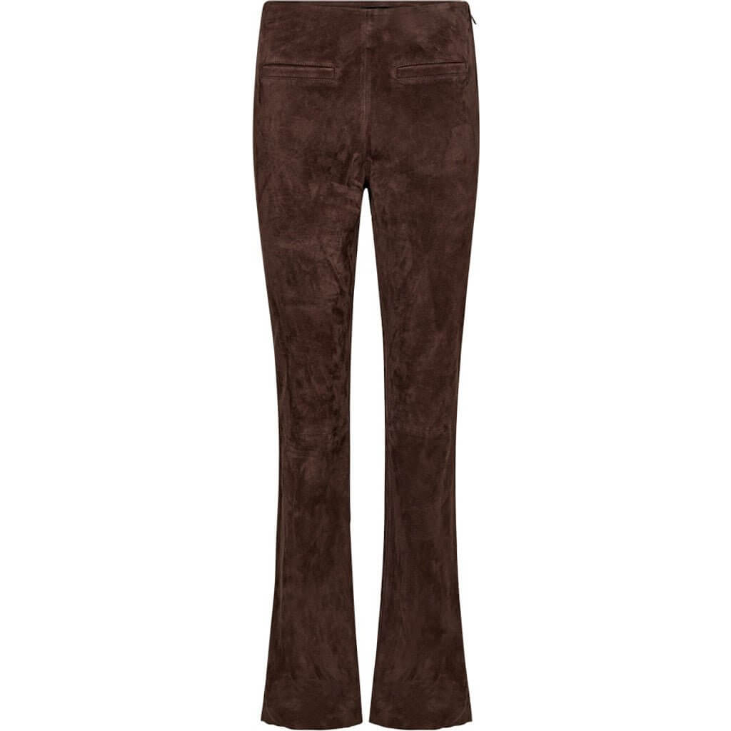 Det lækre ruskind med stræk følger kroppens bevægelser og giver både komfort og fleksibilitet hele dagen. Materialets struktur tilføjer dybde og eksklusivitet til looket, og gør bukserne nemme at style – både med en enkel skjorte, en blazer eller en løs strik. En vaskeægte garderobefavorit, der tilfører et touch af luksus til ethvert outfit.