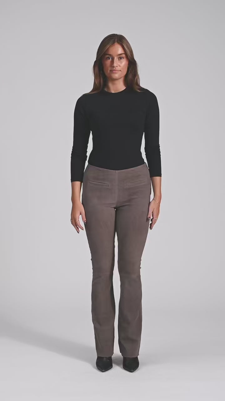 Ava er et par flared ruskindsbukser i fuld længde, fremstillet i blødt, strækbart ruskind af høj kvalitet. De har et enkelt og elegant udtryk, der gør dem til en oplagt style – uanset om du skal til hverdagens gøremål eller en mere festlig anledning. Den regulære pasform med regular waist og flared ben skaber en smigrende silhuet, der klæder alle kropstyper.