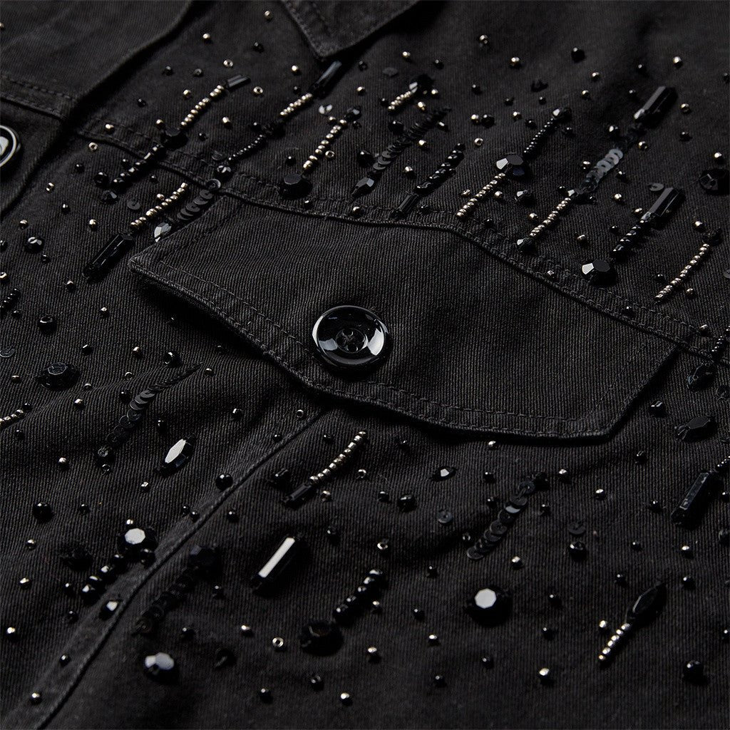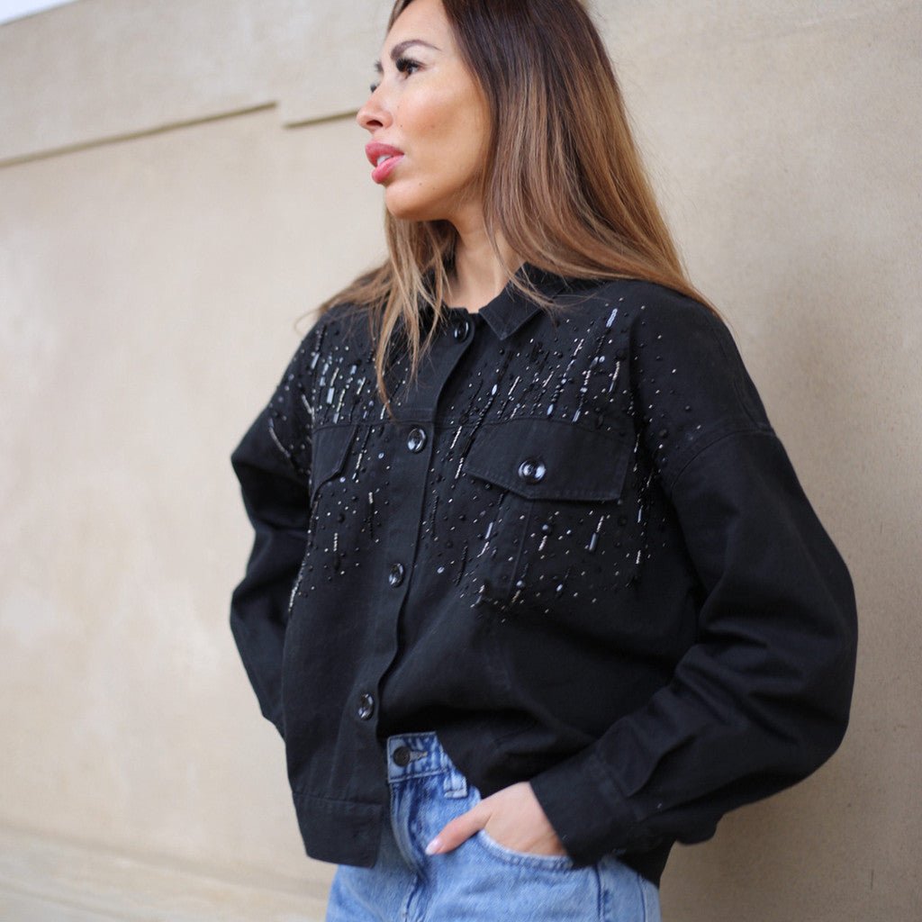 Fronten er smukt dekoreret med perler og pailletter, hvilket giver jakken et feminint og luksuriøst look, der gør den til et perfekt valg til både hverdag og festlige anledninger. Knaplukningen fuldender designet og giver mulighed for forskellige stylingmuligheder. Janet jakken kan bæres som et statement-piece over en enkel kjole eller styles med skindbukser og en bluse for et sofistikeret og moderne outfit.