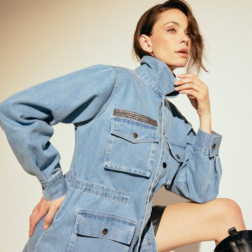 Den er designet med lange ærmer, lommer foran og lukkes udelukkende med knapper, hvilket giver et råt og tidløst udtryk. På ryggen har jakken et dekorativt patch, som tilfører et feminint twist og skaber en flot kontrast til det denim-inspirerede look.