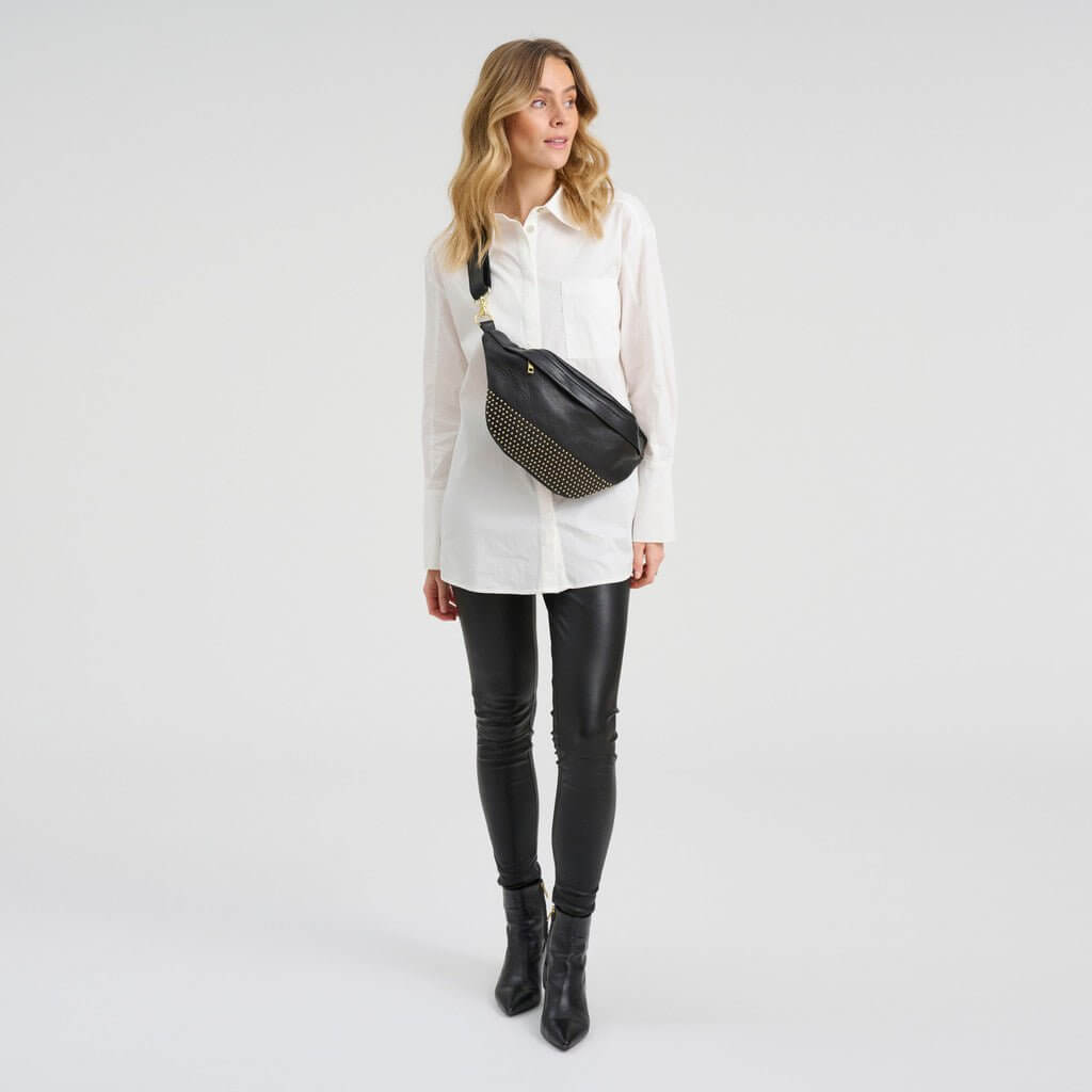 Bucharest bumbag er den perfekte kombination af luksus, funktionalitet og rå femininitet. Tasken er fremstillet i det blødeste 100% lammeskind, som giver en glat, eksklusiv overflade og et elegant udtryk, der føles lige så fantastisk, som det ser ud. De guldfarvede mikronitter dekorerer fronten og tilfører tasken et raffineret og samtidig edgy look - en moderne detalje, der gør bumbag’en til noget helt særligt.