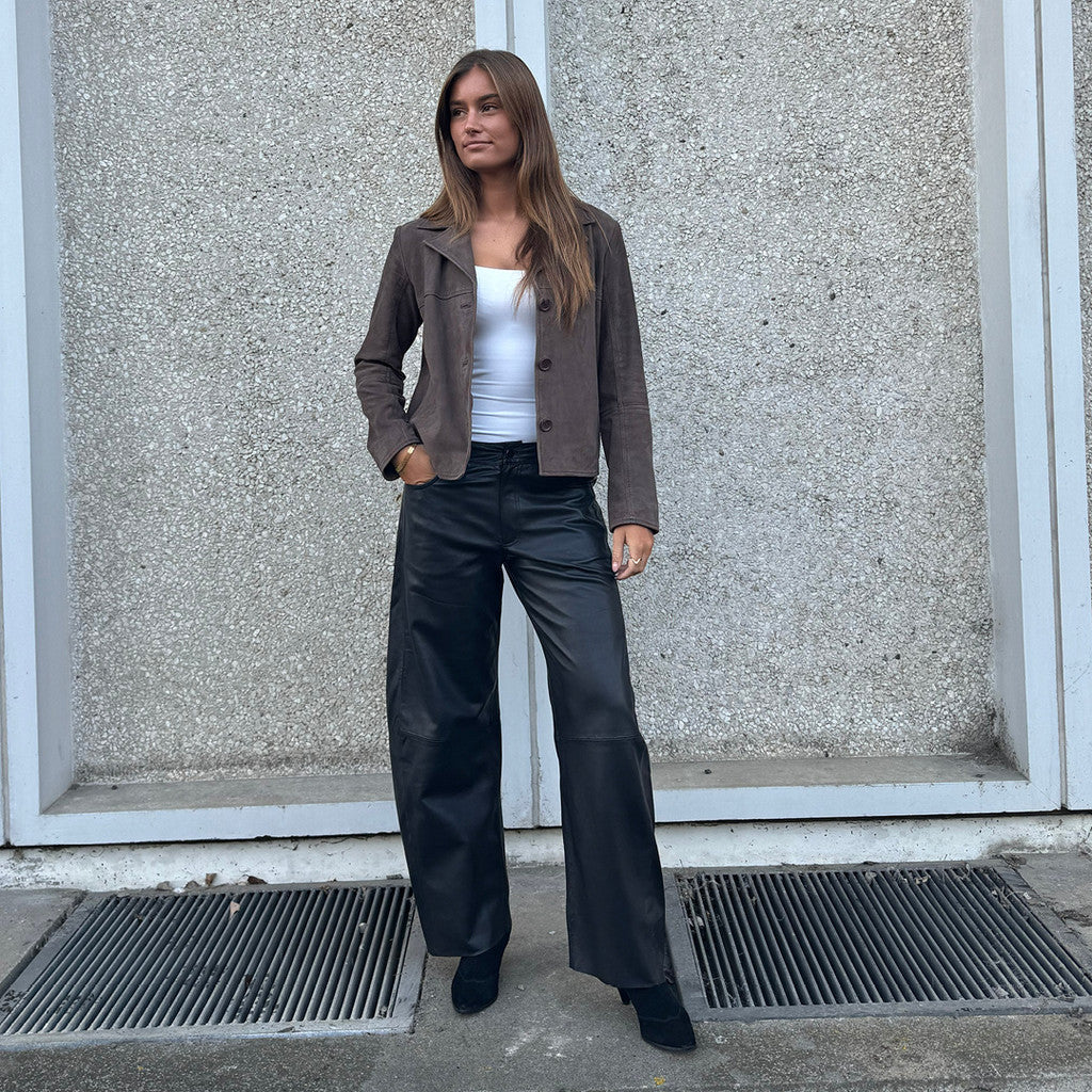Boel barrel bukserne er en af sæsonens helt store trends og et must-have i enhver garderobe. De er fremstillet i det blødeste lammeskind, hvilket giver dem et eksklusivt og luksuriøst udtryk. Med deres rummelige benvidde, afslappede pasform og fuld længde får bukserne et cool og moderne look, der både kan styles casual og elegant.