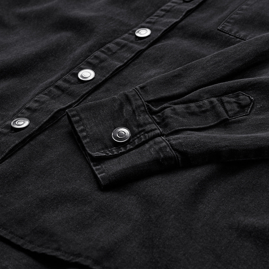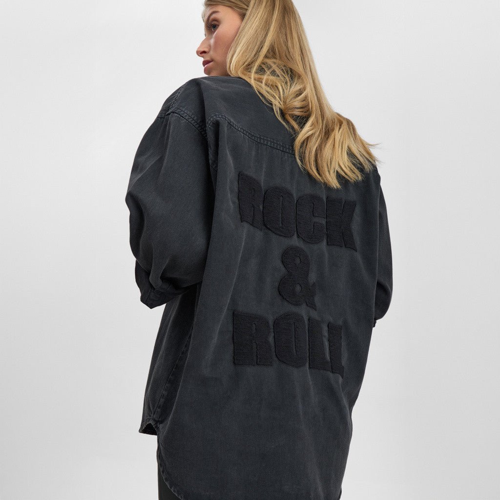 Foran har skjorten to praktiske brystlommer, som understreger det afslappede og funktionelle udtryk. Men det er især bagsiden, der stjæler opmærksomheden: Her finder du et broderet motiv, som giver skjorten kant og personlighed – perfekt, hvis du vil tilføje lidt ekstra attitude til dit outfit.
