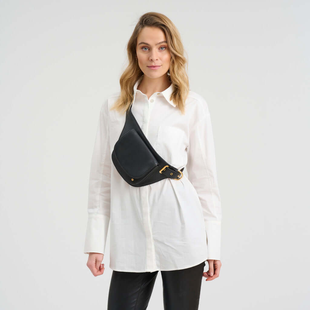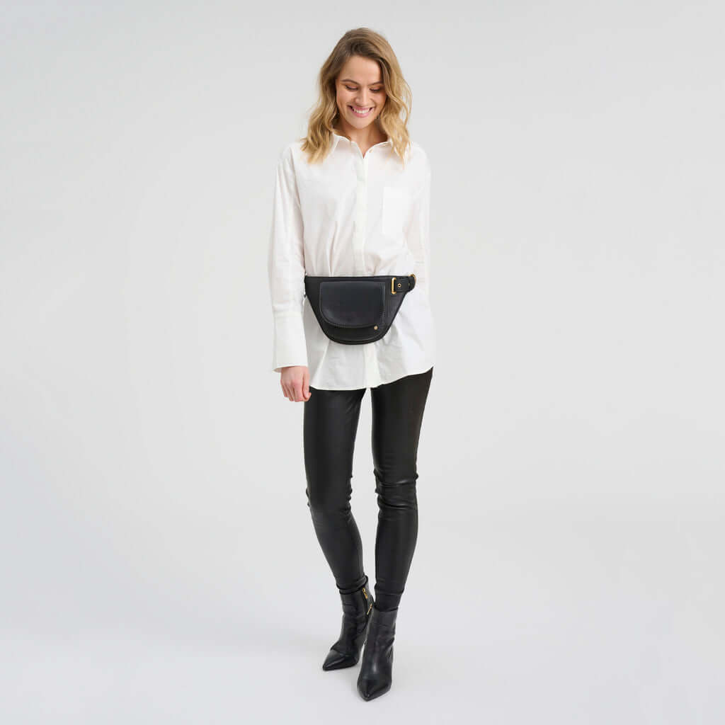 Denne bæltetaske/bumbag kombinerer klassisk sadeltaske-silhuet med moderne funktionalitet - et tidløst design, du kan bruge sæson efter sæson. Tasken er fremstillet i 100% koskind, som giver den et glat og eksklusivt udtryk med en holdbarhed, der gør den perfekt til hverdagsbrug. Den elegante form og afrundede flap giver et sofistikeret og minimalistisk look, der let kan styles til både casual, feminine og mere rå outfits.